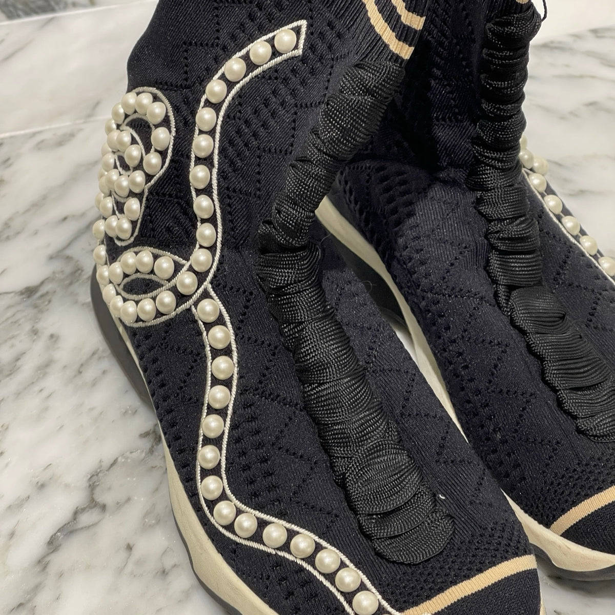 FENDI Black Knit Fabric Pearl Embellished Slip On High Top Sneakers Size 37(23.5cm) フェンディ ブラックニット フェイクパール装飾 スリッポン ハイトップ スニーカー サイズ37(23.5cm)
