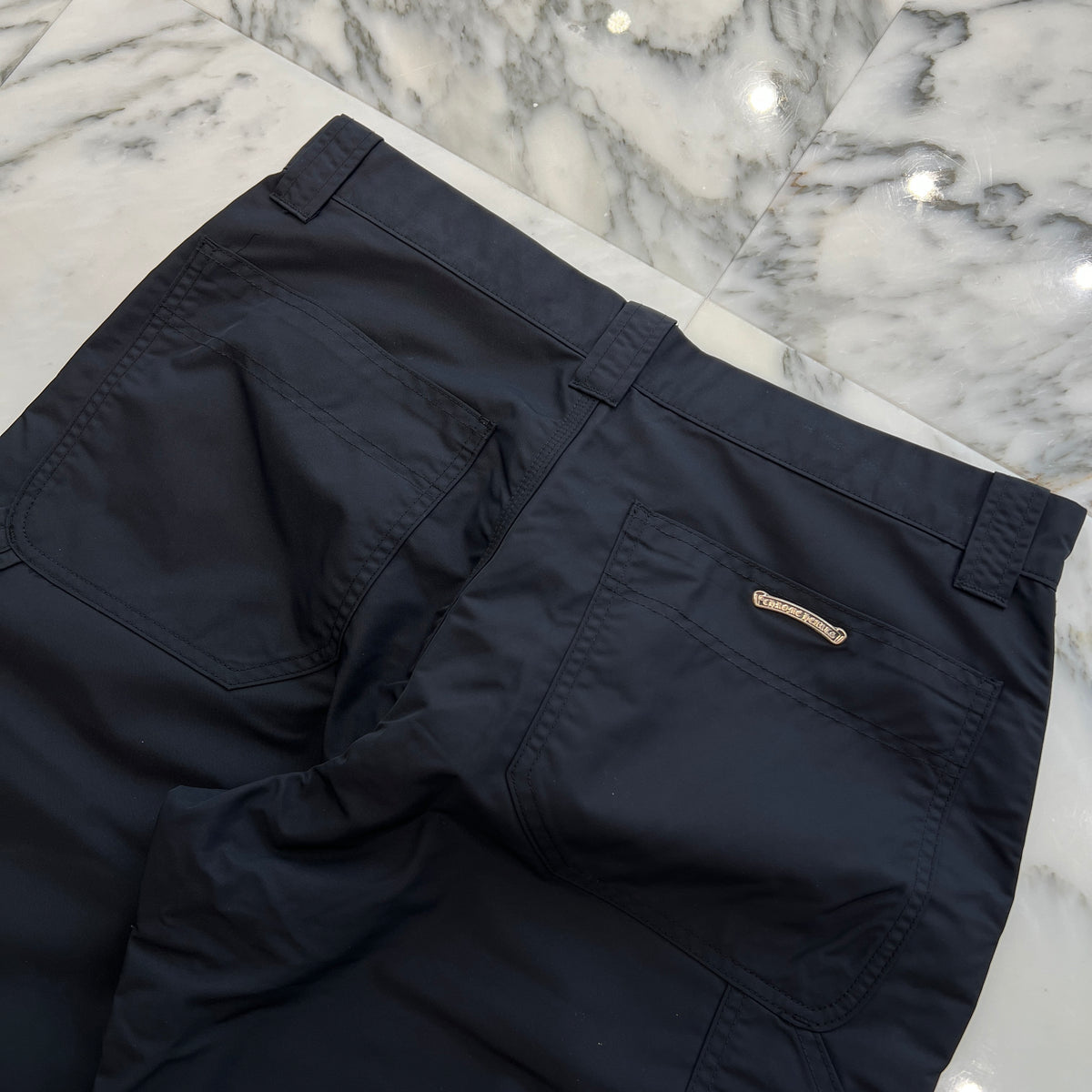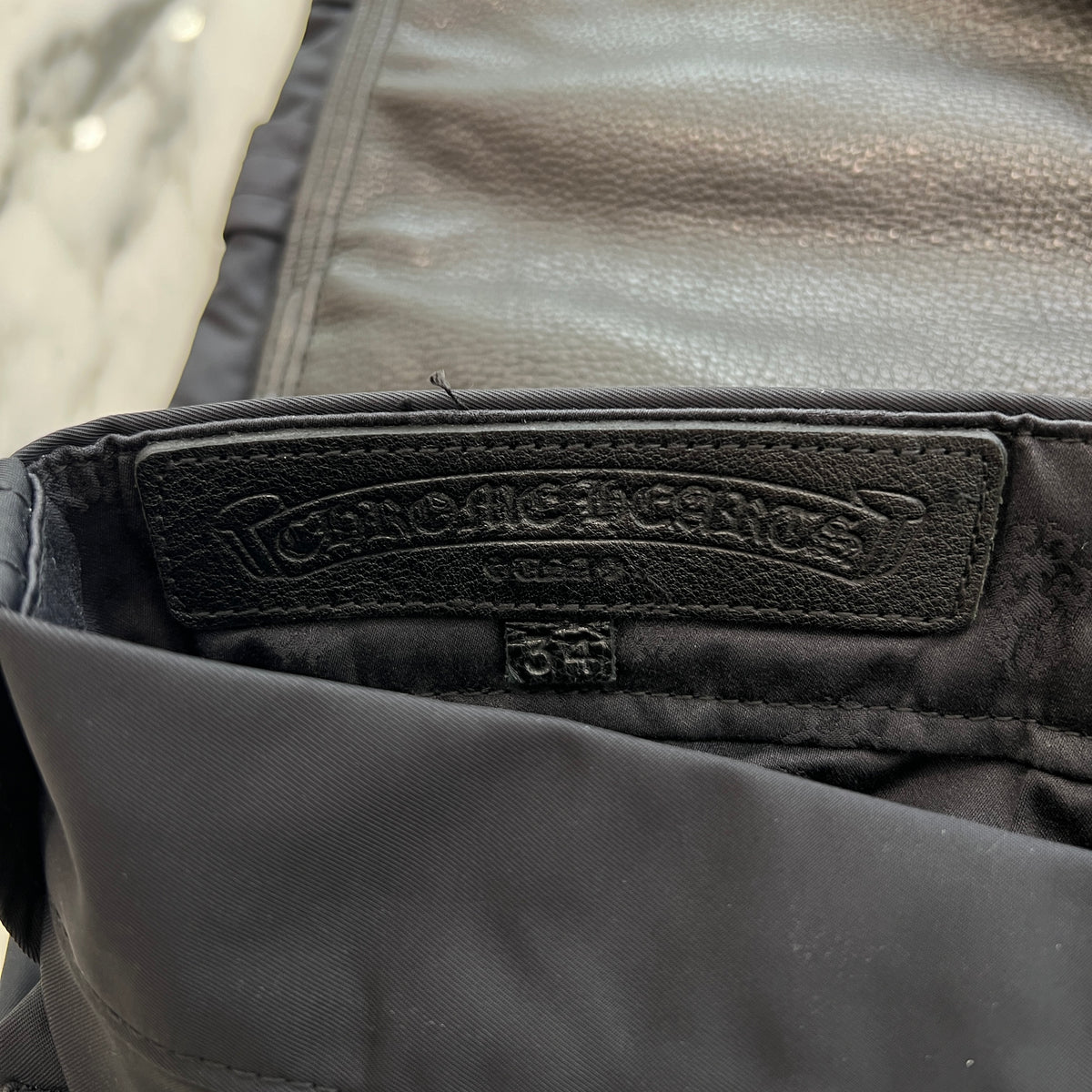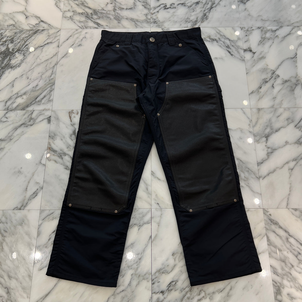 CHROME HEARTS Carpenter Leather Double Knee Nylon Leather Cross Patch Pants Size 34 クロムハーツ カーペンター レザーダブルニー ナイロン レザークロスパッチ ロングパンツ サイズ34