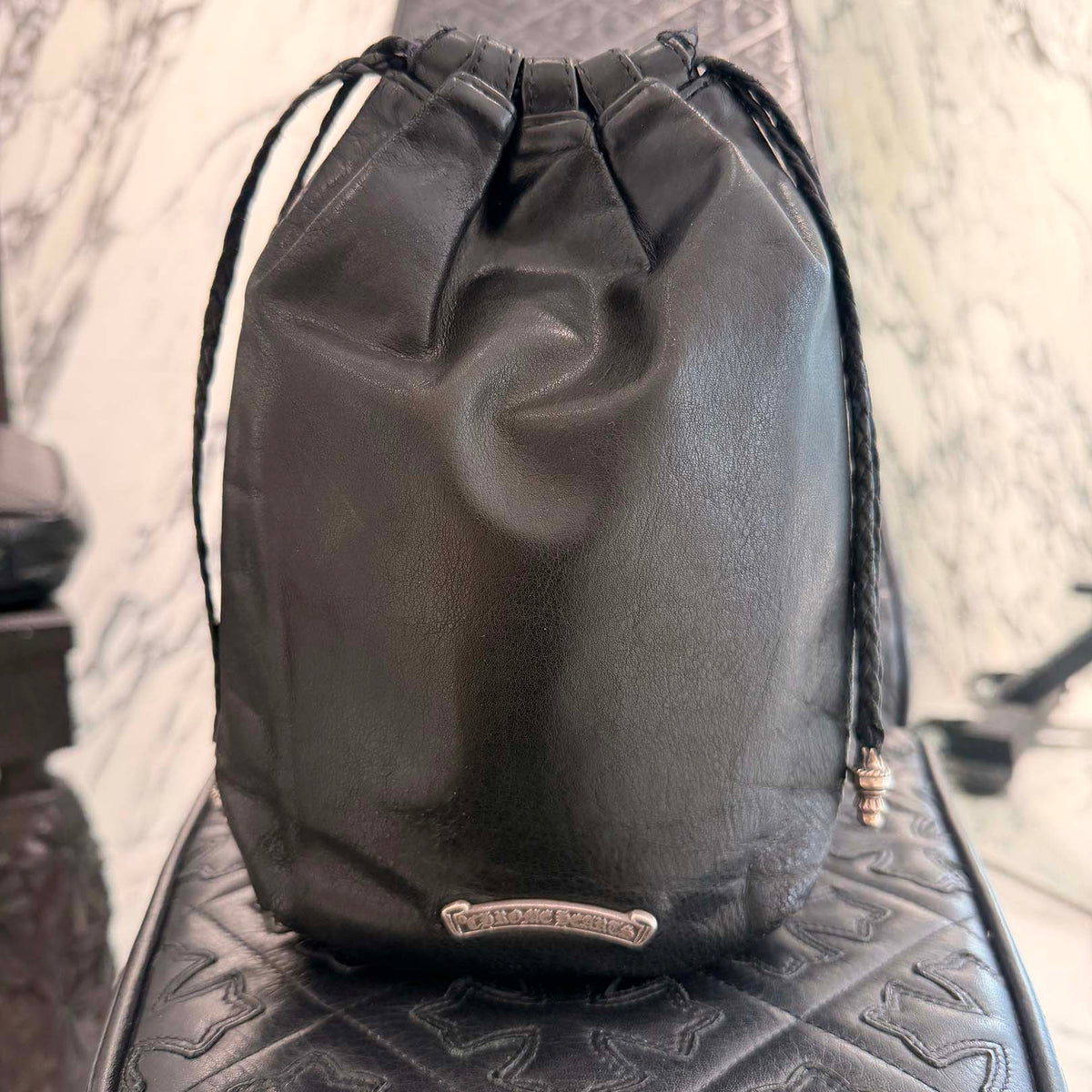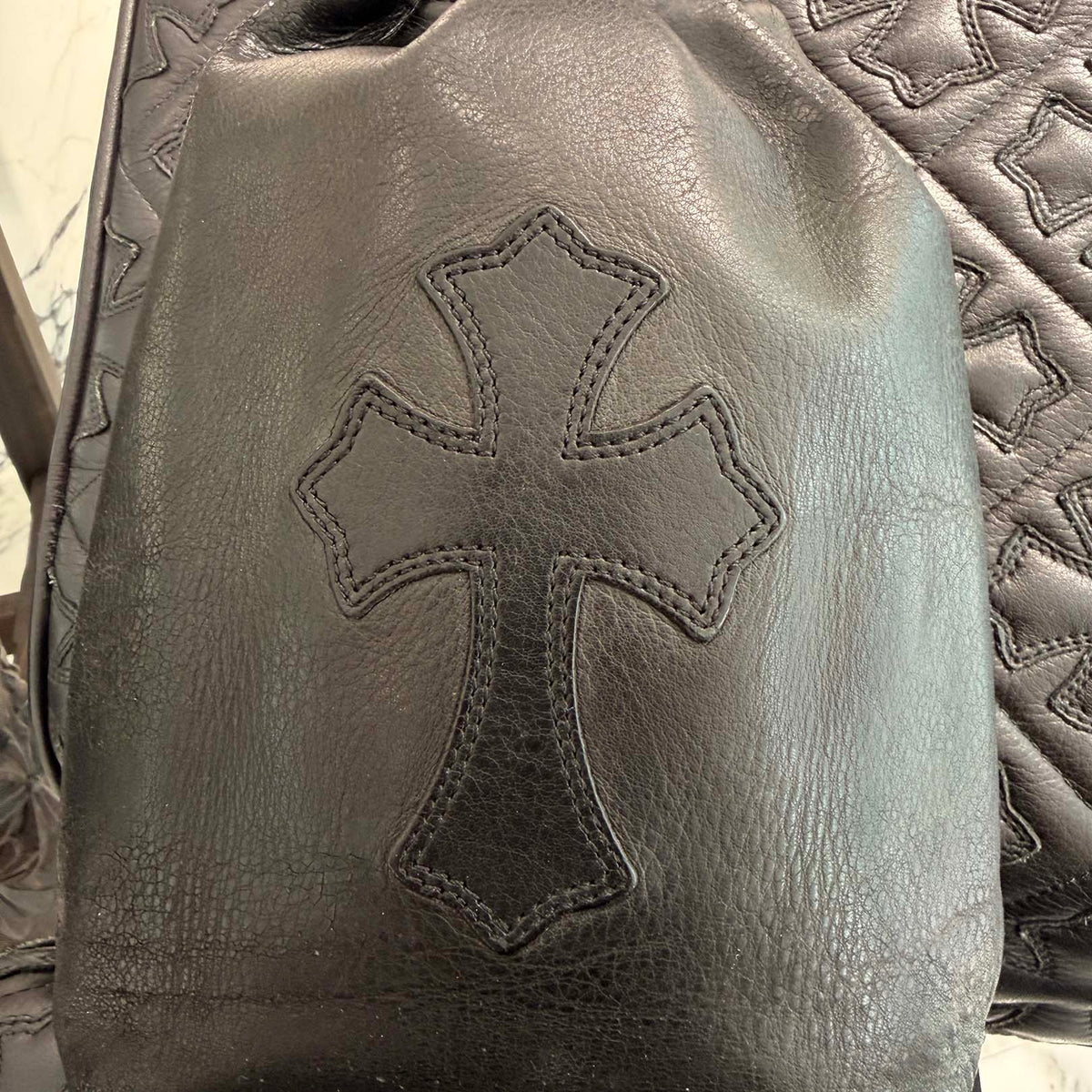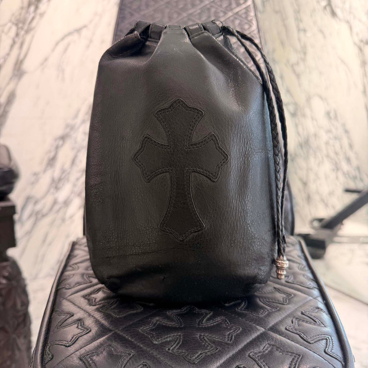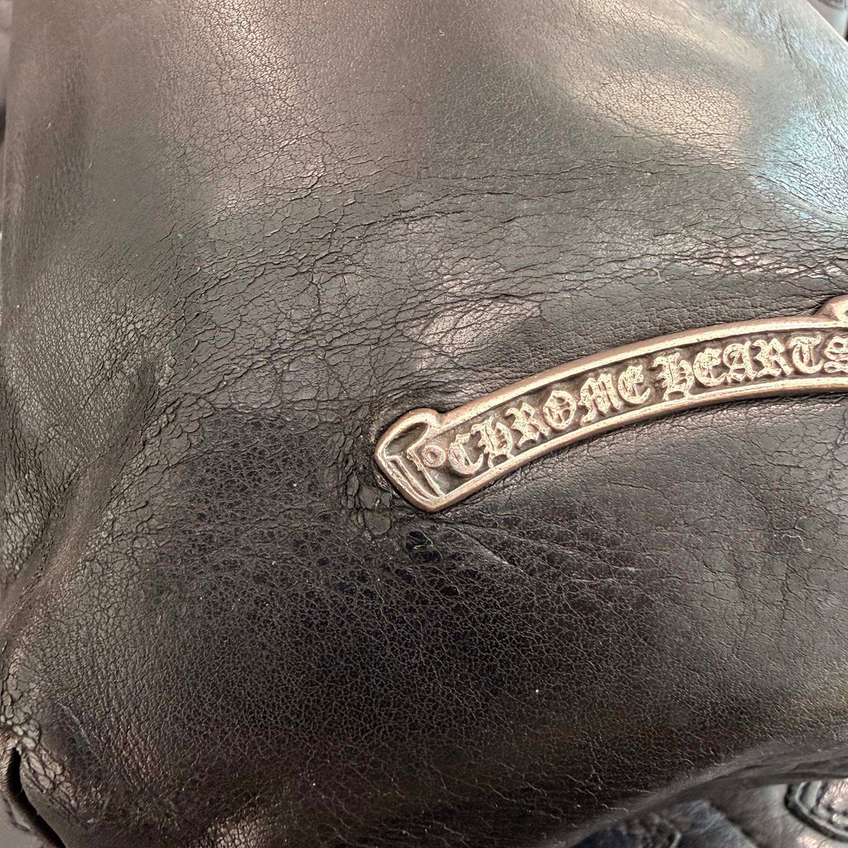 CHROME HEARTS Leather Cross Patch Drawstring Sack Leather Bag クロムハーツ レザークロスパッチ ドローストリング サックレザーバッグ 巾着